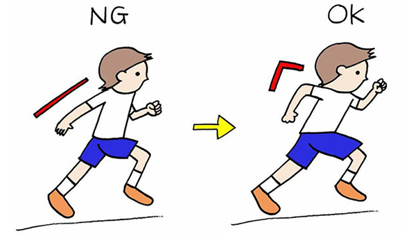 足の動きは腕の動きと連動します。そのため、足を速く動かすには、腕を多く速く振ることが重要です。ヒジを90度に曲げ、手のひらは開いた状態で振り子のように大きく振るようにしましょう。