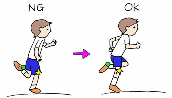 地面をとらえ後ろに蹴り上げる足のひざは、おへその辺りまで上げるようにしてください。ひざだけを意識するとやりづらく感じるかもしれませんが、くるぶしの位置を意識することで自然とひざを上げることができるようになりますよ。後ろに蹴り上げる足のくるぶしが、軸足のひざの横を通るように走るようにしましょう。