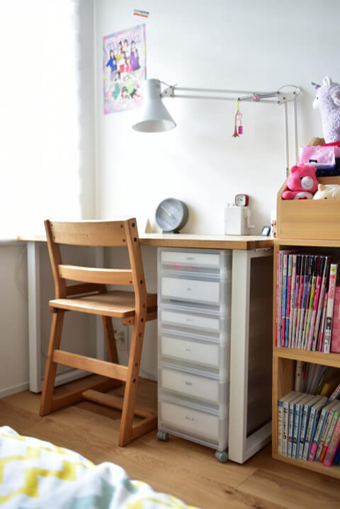子ども部屋の家具は、シンプルなものがベスト。キャスターを付けると、移動や配置がしやすく、フレキシブルに使えるので便利です。そうすれば「今日はリビングで勉強したい」といった子どもの気持ちにも柔軟に対応できます。