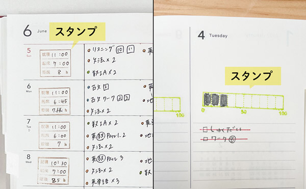 手帳にスタンプを活用した例。市販のスタンプを枠にして、左は就寝/起床/睡眠時間、右は勉強した時間(10分で1マス塗りつぶす)を記録。