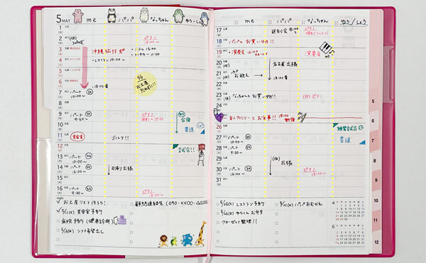 まだ一人では手帳を管理できない場合や家族の予定全体を見える化したい時は、ファミリー手帳を使ってみましょう。出張や家族旅行など、家族それぞれとみんなの予定をシェアすれば、家族イベントの調整もしやすくなります。みんなが見られるようリビングなどの定位置に置き、写真に撮っておけば外出先でもスマホで確認できます。アプリと手帳をW使いする人も増えているそう。
