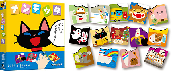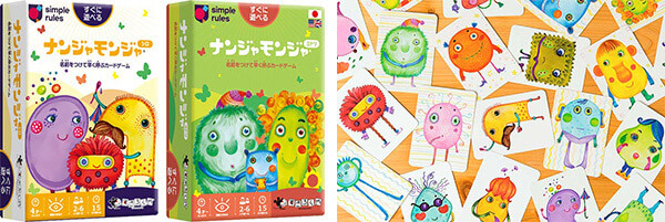 頭と手足だけの謎生物ナンジャモンジャ族が描かれたカードをめくり、その人のセンスでナンジャモンジャの特徴をとらえた名前を付けます。それを全員で覚え、以降、めくられたらその名前をいち早く叫ぶことでたまったカードを獲得し、集めた枚数を競うゲーム。「ナンジャモンジャ・シロ」と「ナンジャモンジャ・ミドリ」があり、どちらからでも遊べ、2つのパッケージを混ぜると12人まで遊べます。メーカー/ すごろくや(日本)