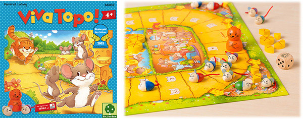 サイコロを振って自分の4~5匹のねずみを進めながら、追いかけてくるねこに捕まらないように、より多くのチーズ片を集めるゲーム。部屋に逃げ入ったり、ねこに捕まったりして、動かせるねずみがいなくなったらゲーム終了。それまでに獲得したチーズ片の得点を数えて、一番を決めます。メーカー:Pegasus Spiele (ペガサス・シュピーレ, ドイツ)