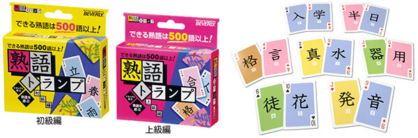 トランプの各カードに書かれた漢字を使って、「熟語 七ならべ」「熟語 神経衰弱」など、さまざまなルールで知識と組み合わせを楽しめるカードセット。初級編と上級編があります。メーカー/ ビバリー(日本)