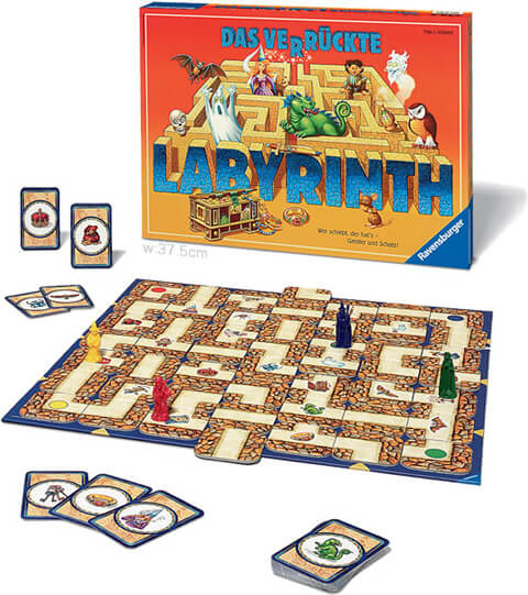 タイルが敷き詰められてできた迷路を、列ごとにダイナミックに変えていき、自分のコマを目的の宝の場所まで導いていくゲーム。目的地にたどり着いたら、カードを公開し、次のカードの目的地を目指します。こうしてゲームを続けていき、決められた枚数をこなしてから、先にスタート地点(四隅の角)に戻った人が勝ちです。メーカー/Ravensburger(ラベンスバーガー, ドイツ)
