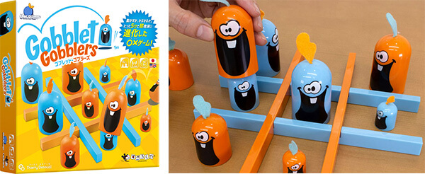 3×3のマス盤面に自色駒の縦/横/斜めの1列を作るため、駒を置いたり、動かしたり、小中大のサイズ差を生かしてかぶせたり、かぶせを外したりしていく対戦ゲーム。3×3のマス目には何もなく、各自手元に自分の色の駒(ゴブラーズというキャラクター)を用意した状態から始めます。交互に、自分の駒1個を取って、空いているマスか、より小さい駒にかぶせるように置くか、既に置いてあるものを動かすかを考えながら、縦/横/斜めの1列に自色のゴブラーズ3個を並べた人の勝ちです。メーカー/BlueOrange(ブルーオレンジ, フランス)