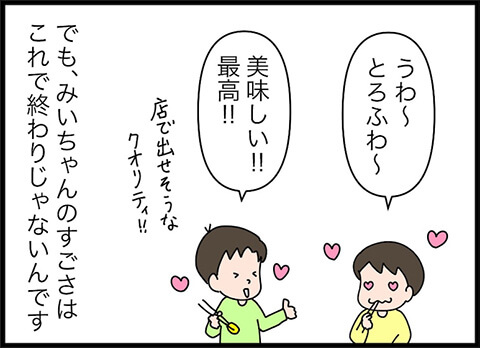 次回は、みいちゃんの料理スキルがどのくらいアップしたのか、エピソードを交えてご紹介します。お楽しみに!