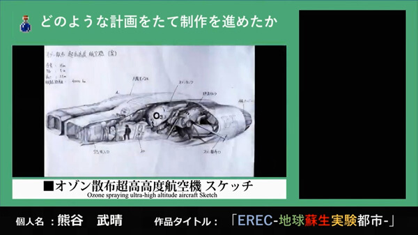 2度目の挑戦で大賞に輝いたのは、山口大学教育学部附属中学校3年生の熊谷武晴さん。個人での参加です。作品名の「EREC」はEarth Revival Examination City(地球蘇生実験都市)の略。地球再生のヒントは地球外にあるだろうとの考えから、宇宙博物館をもつ未来の都市です。オゾンホール増加問題は、オゾン散布超高高度航空機で解決します。圧倒的な世界観で強い印象を残し、審査員満場一致で大賞を受賞。建築賞とのW受賞となりました。