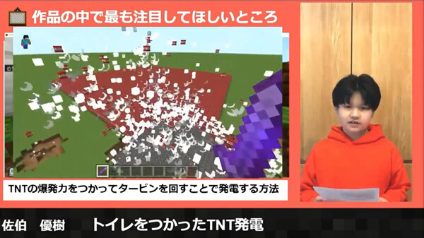 佐伯優樹さん(小4・神奈川県)の作品「トイレをつかったTNT発電」。コーディング賞を受賞。