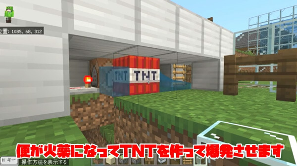レッドストーン回路を使ったTNT発電システムにより、自然豊かな場所でも住民が発電しながら暮らすことができる未来の家。「江戸時代の便による火薬づくりを調べました。たぶん相当臭かったと思います」と佐伯さん。