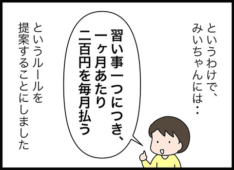 大人と同じように、習い事のお金を自分で支払ってもらおうと考えたえみさんのご家庭。もちろん全額支払うのは難しいため、「1つの習い事1ヶ月につき200円払ってもらう」というルールを決めることにしました。