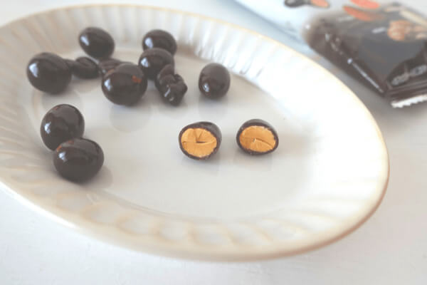 カリカリ香ばしい食感のナッツをコーティングしているチョコレートは、甘さ控えめでビターな味わい。表面がツルツルしているので、チョコが手につきにくいのもうれしいポイント。