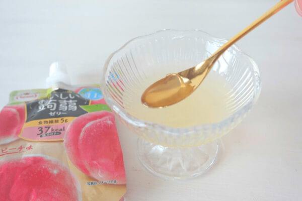 次にご紹介する糖質10g以下のおやつは、ピーチの優しい甘さと香りが楽しめる【おいしい蒟蒻ゼリー ピーチ味】。