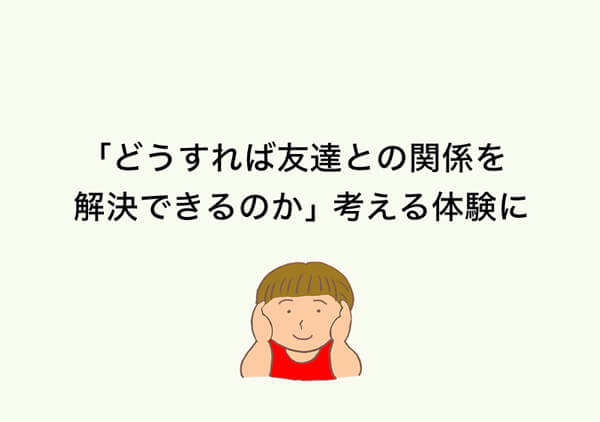 「相手の気持ちはどうだったのかな?」「どうすればよかったかな?」と問いかけ、子ども自身が考えることで、「協力的問題解決」の力が伸びていきます。