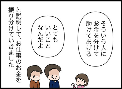 「お金の教育を1年間継続したら小学1年生がとんでもなくすごいことになった話」第27回目からは「寄付」についてのお話です。自分で稼いだお金を、4つに振り分けているみいちゃん。その中の一つに、人のために使う「寄付」があります。