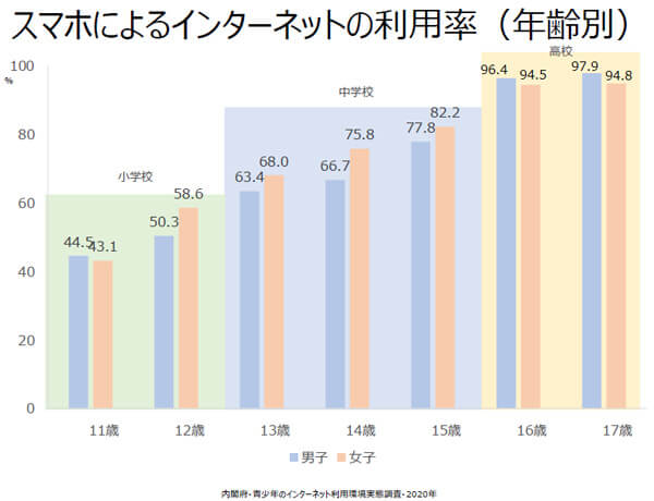 内閣府のデータによると、スマホ所有は小学校高学年でほぼ半数、中学生の間に6~8割と増えていき、高校生ではほとんどの子どもが所有しています。