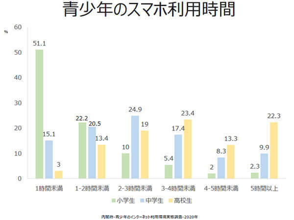 スマホ利用時間は小学生では1時間未満が多いですが、やはり中学生・高校生となるにつれて増加し、高校生では5時間以上利用する割合が22%にものぼっています。