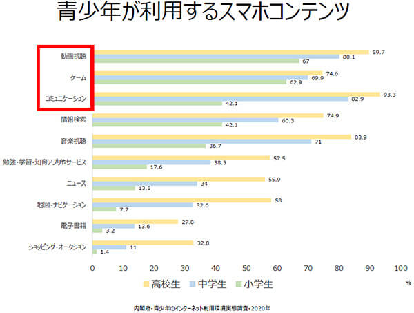 小学生では動画視聴・ゲームが多く、中学生になるとSNSなどのコミュニケーション・音楽視聴が加わり、高校生になるとさらに幅広いコンテンツを利用していることがうかがえます。