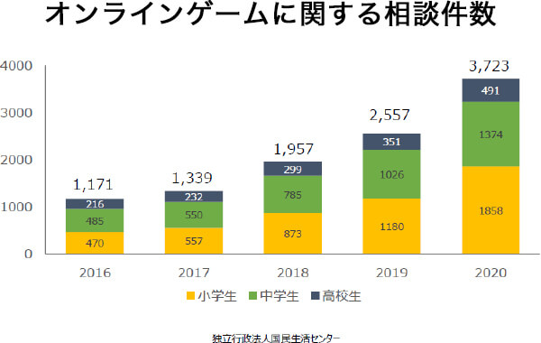 ここ数年で相談件数は右肩上がりに増えており、特に小学生の増加が著しい状況です。相談の内容は課金に関するトラブルが多く、親の気付かないところでクレジットカードを使い、100万円単位で請求が来た、といった相談もあります。