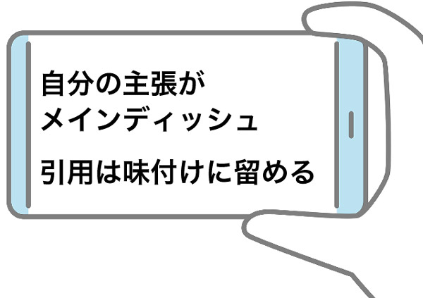 ネット上の情報をコピペしてレポートや論文を書くと著作権侵害になりますが、「引用」という形で利用することは可能です。引用にはいくつかの条件・ルールがあって、出典を明示し、どこからが自分が書いた文章で、どこが引用なのか、明確にわかるように書きます。大事なことは、自分の伝えたいことがメインになっていること。それを補うために引用する分には構いませんが、あくまでも調味料であり、自分の料理として出してはいけません。