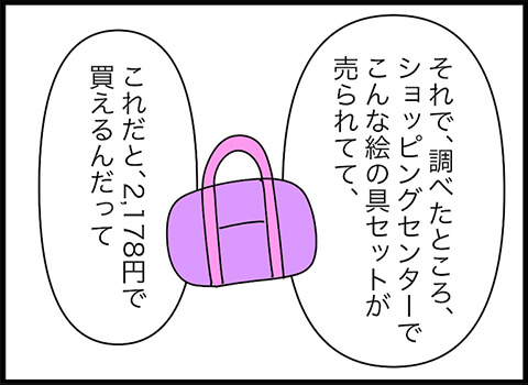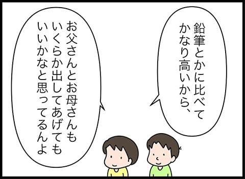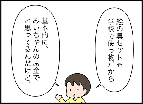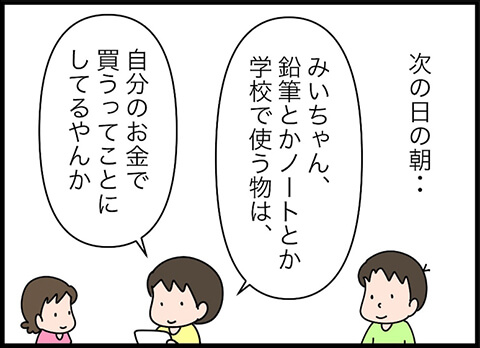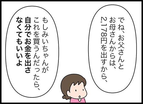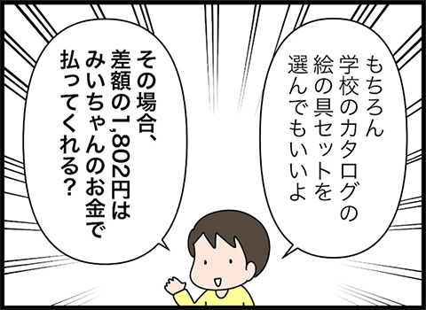 旦那さんが考えたプランとは「ショッピングセンターで売っている値段までは親が出すけれど、それ以上になる場合は子どもが出す」というものでした。これは画期的ですね。しかしこのプランに、みいちゃんは驚きを隠せない様子。欲しい絵の具セットが決まっていたのですから、当然かもしれませんね。
