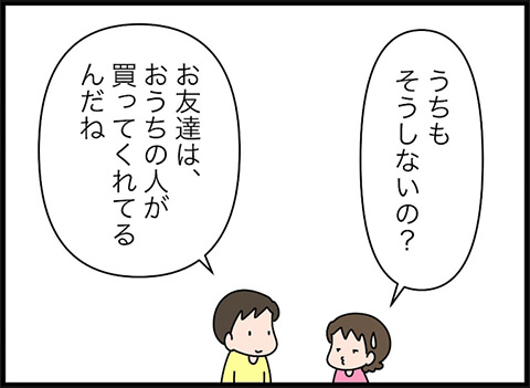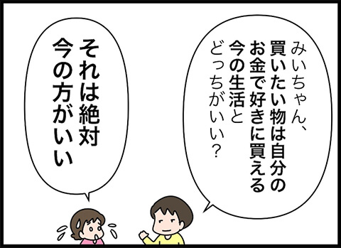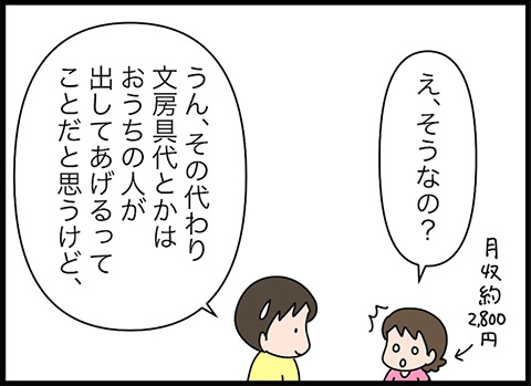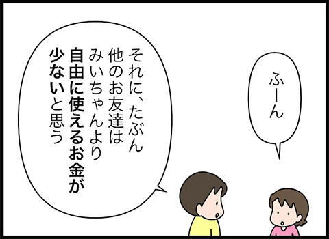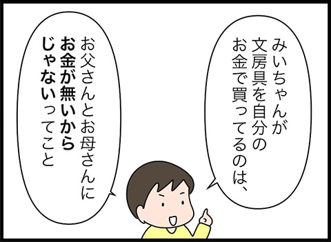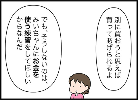 「友達はおうちの人が全部買ってくれている」ことに、今まで疑問を感じていたみいちゃん。えみさんは、その疑問に対して、改めてお金の教育をしている理由を伝えました。そして、決してみいちゃんが損をしているわけではない、ということも。