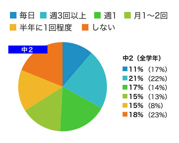 では、中学生がいるご家庭では、どのくらい親子げんかをしているのでしょうか。中1〜中3の結果をそれぞれ見ると、週1回以上親子げんかをしていると回答したかたが4〜5割、週3回以上が3〜4割を占めました。