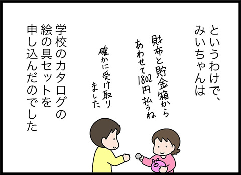 「小学2年生が学校用の絵の具セットを購入した話」第13回目です。前回、自分のお金で必要なものを買うことで、みいちゃんにどんなメリットがあるのかを伝えたえみさん。お金の教育を1年以上受けてきたみいちゃんは、どう感じたのでしょうか?