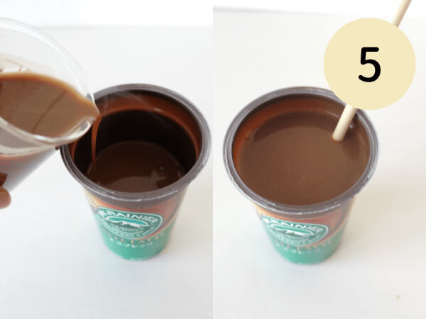 5で混ぜ合わせたコーヒーを氷水でとろみがつくまで冷やすと、固まる時間を短縮できます。