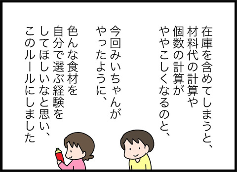 また、家の在庫に関係なく材料はすべて購入するルールにした背景にも、さまざまな思いがありました。みいちゃんが無理なくいろんな経験ができるように考えられた、最適なルールだったようです。
