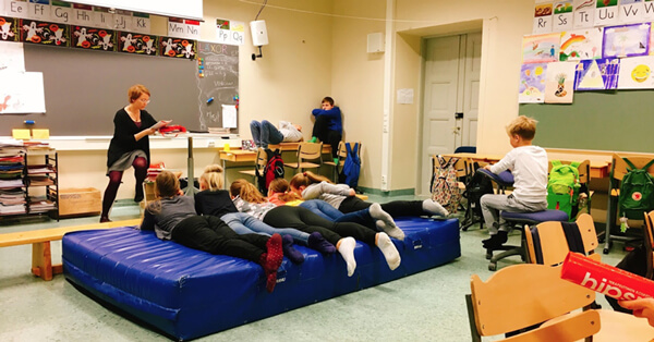 先生がお話を読み、子どもたちは自由なスタイルで聞く授業風景。出典:建石尚子さんのnote。写真:建石尚子
