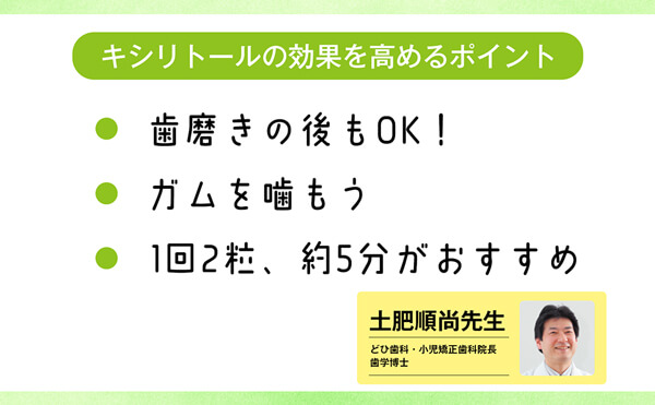 効果的に食べるには、どれくらいキシリトールを食べればよいのでしょうか。土肥先生によると最低量として「粒ガムなら1回に2粒を口に入れ、5分ほど噛む」を1日3回繰り返すことがおすすめ。これ以上取り過ぎてはダメといったこともないそうです。また、まとめてたくさん食べるより、一日何回かに分けて食べるほうが効果を期待できます。
