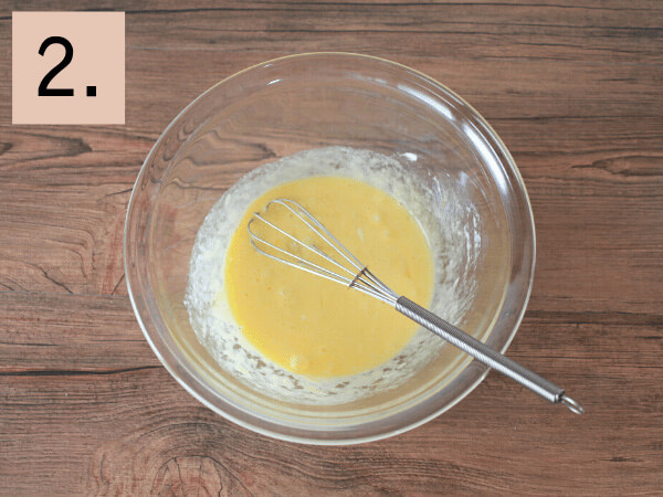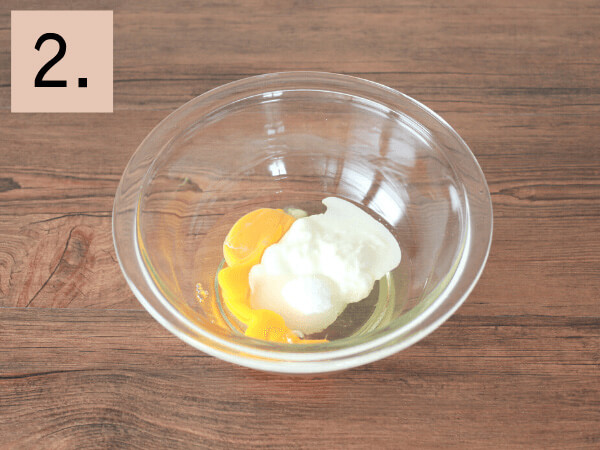 2.ボウルに卵、プレーンヨーグルト、砂糖を入れ、なめらかになるまで混ぜる。