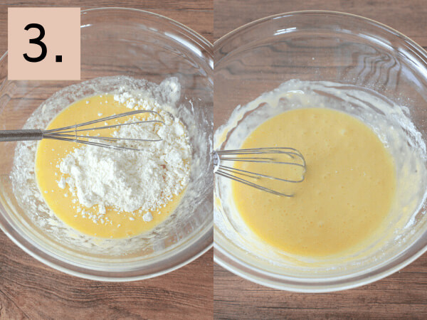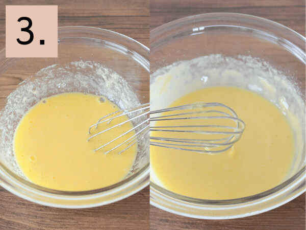 3.ホットケーキミックスを入れ、ダマがなくなるまで混ぜる。