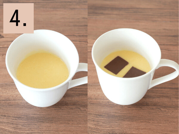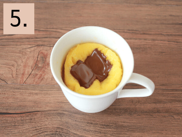 4.マグカップに生地を移し、チョコレートを入れる。加熱するとチョコレートが沈むので、飾り用に2枚とっておく。