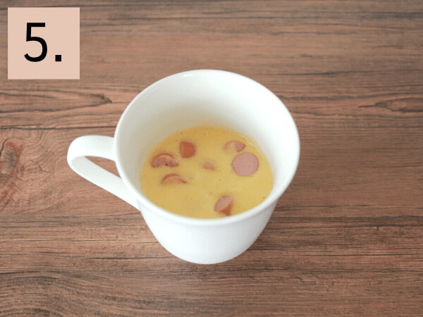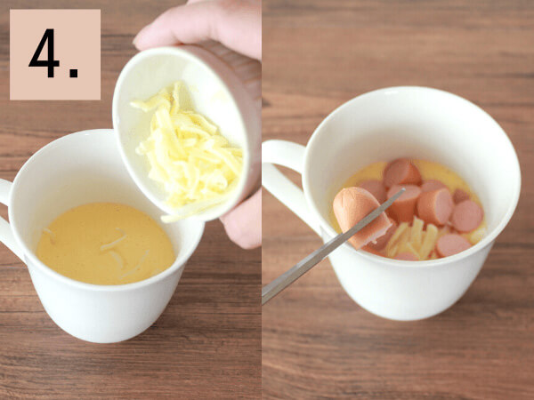 4.マグカップに生地を移し、ピザ用チーズを入れる。ウインナーは調理ハサミで1cm幅に切り、生地の上にのせる。