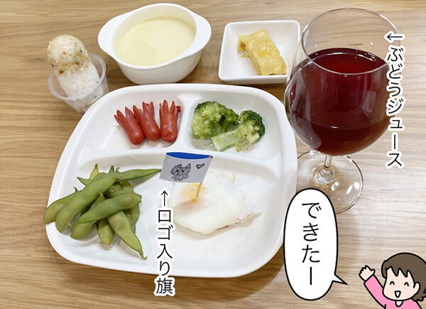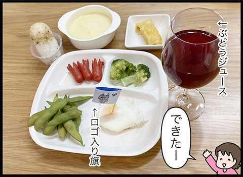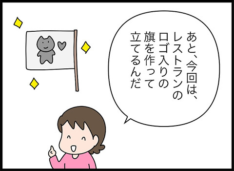 なんとか交渉をして、とうくんもお手伝いを再開! ロゴ入りの旗も立てて、前回よりもグレードアップしたお子さまセットの完成です。みいちゃんもとうくんも、がんばりましたね!