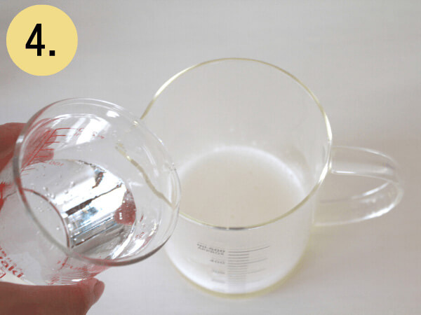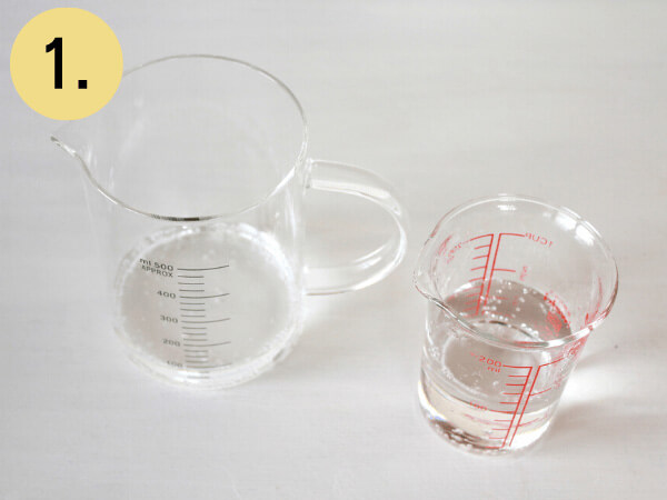 1. 500mlの計量カップに、ソーダ飲料の半量(100ml)を入れる。