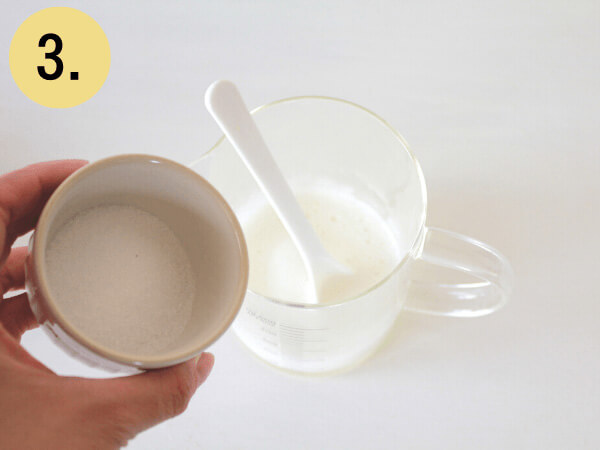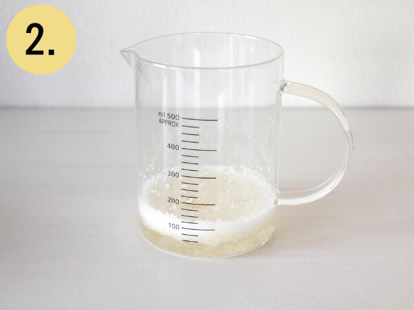 3. 600Wの電子レンジで40秒加熱し、混ぜてゼラチンを溶かす。砂糖も加える。