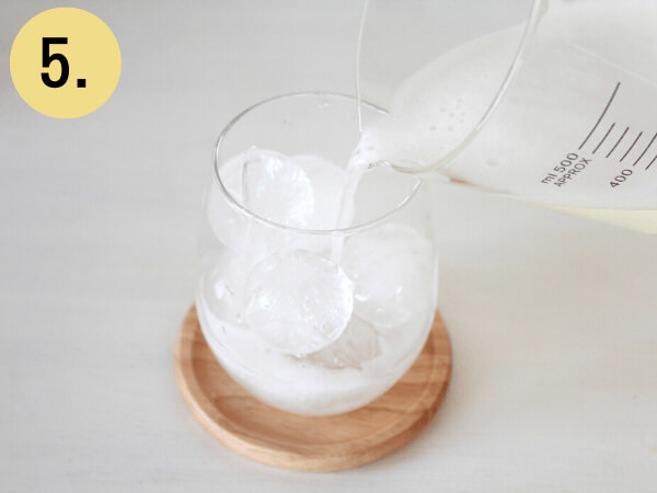 5. グラスに氷を入れ、ゼラチンを混ぜたソーダ飲料を静かに注ぐ。混ぜずにそのまま10分ほど待つ。