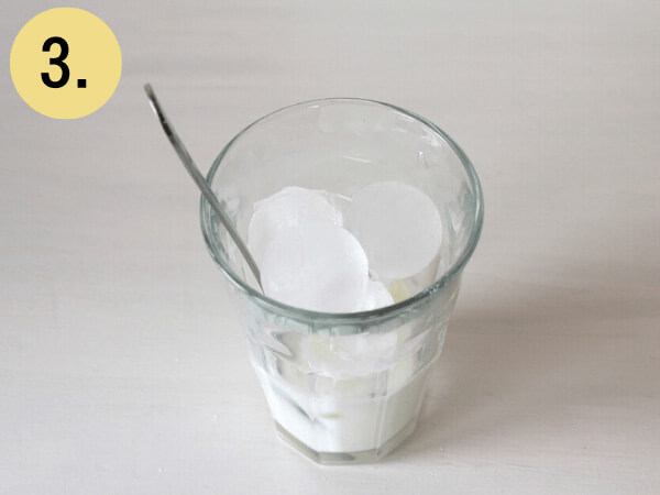 2. 大きめのグラスに牛乳を注ぎ、砂糖を入れてよく混ぜる。