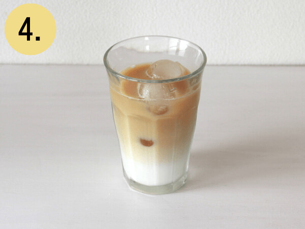 上からほうじ茶を注ぐと比重の差で牛乳と混ざらず、キレイな2層に分かれます。