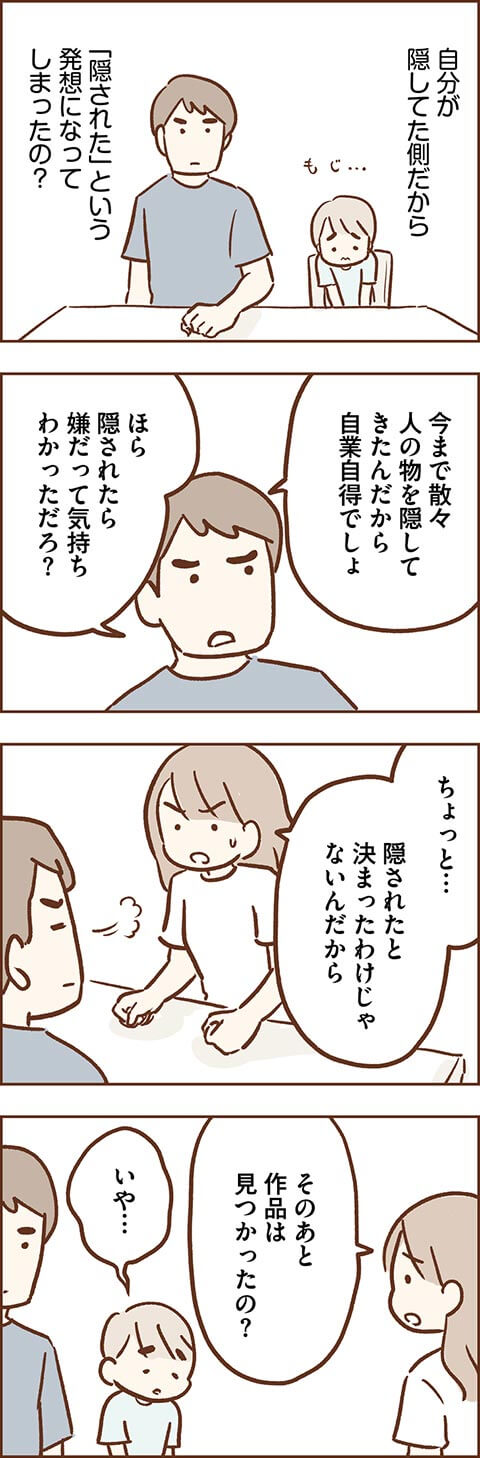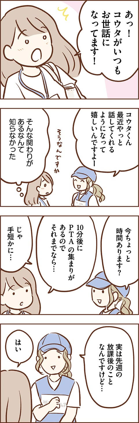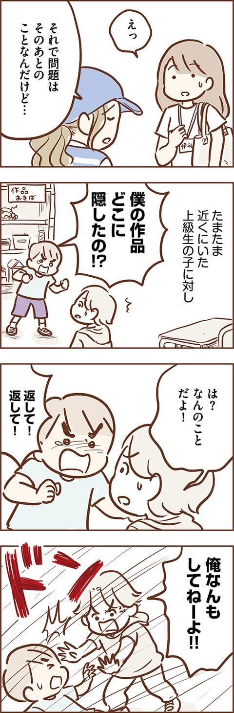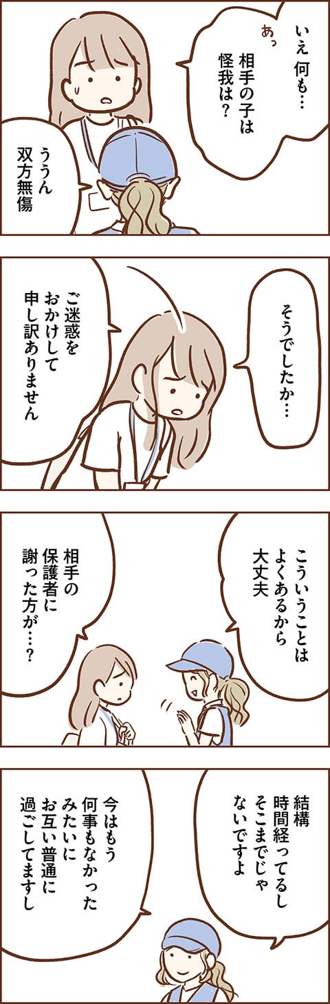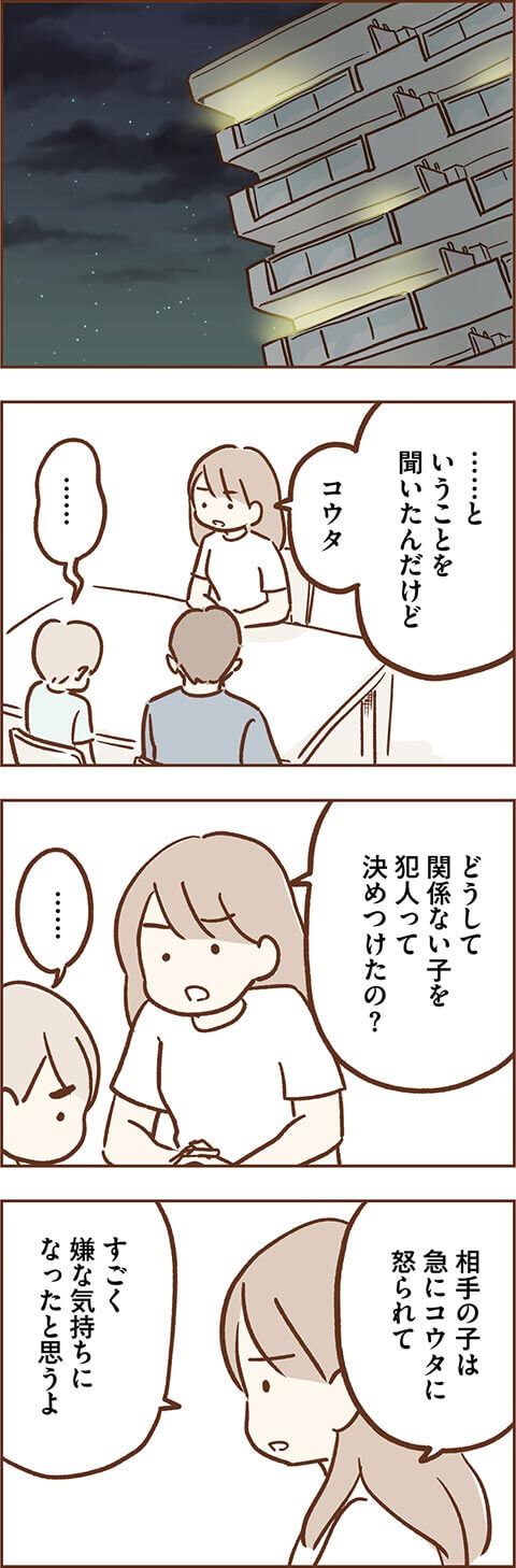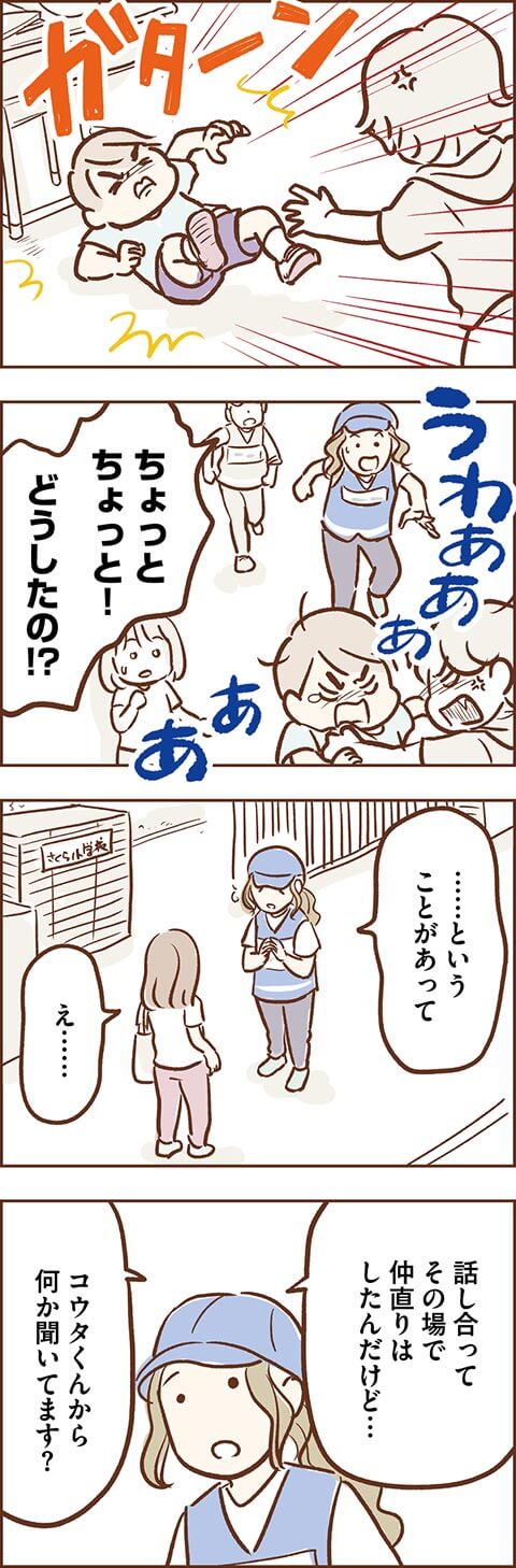 お友達を叩いてしまったコウタ。頭ごなしに叱ってしまった母カンナですが、その背景にはお友達のコウタへの嫌がらせがあったことを知り、子育ての難しさを痛感します。そんななか、今度はまた別のトラブルが発覚したようで……。