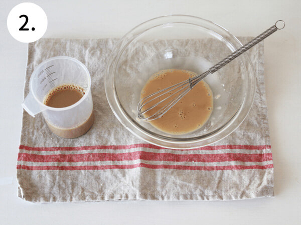 2. 片栗粉にコーヒー牛乳を3回に分けて入れる。片栗粉がダマにならないように、その都度よく混ぜる。