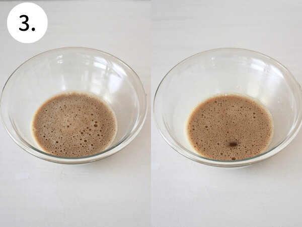 3. 600Wの電子レンジで30秒加熱し、泡だて器で混ぜる。同じ作業をもう一度繰り返す。