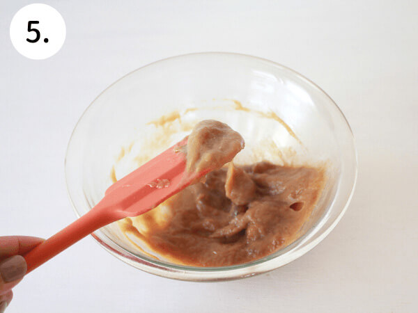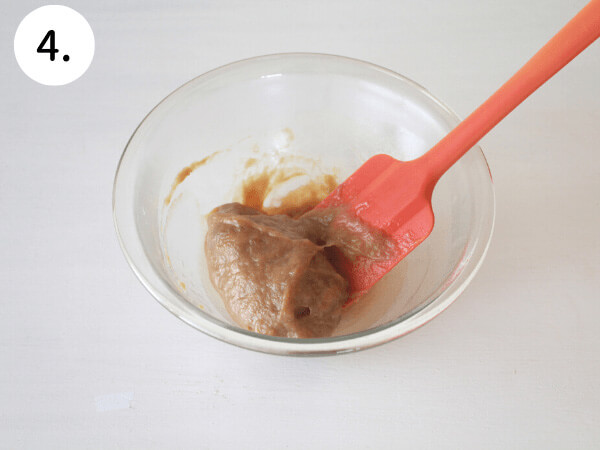 4. さらに600Wの電子レンジで50秒加熱し、ゴムベラでよく混ぜ合わせる。粘りが出てきます。