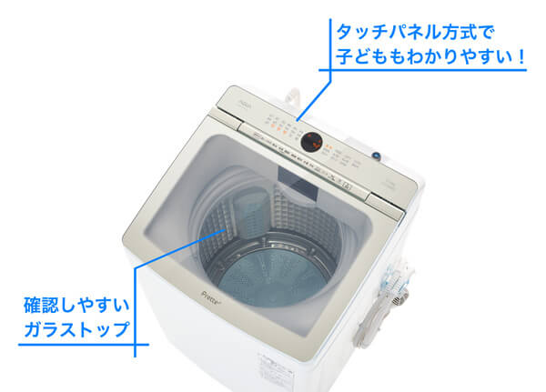 AQUA(アクア)の洗濯機「Prette(プレッテ)」シリーズは、洗剤・柔軟剤自動投入機能があり、毎回の計量や投入の手間を省き、入れ過ぎを防ぐこともできます。また、タッチパネル方式で操作しやすく、ガラストップで洗濯物がきれいになっていく過程が見えるので、洗濯機を使うのが不慣れな子どもにもまかせやすいですよ。