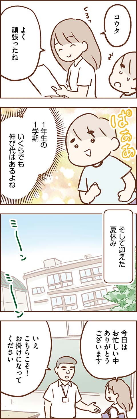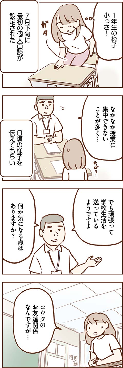 落ち着きがなく、トラブル続きだったコウタもなんとか1学期終了。母カンナは、はじめての個人面談に出向いたものの、予想もしなかった先生の言葉に戸惑ってしまったようで……。