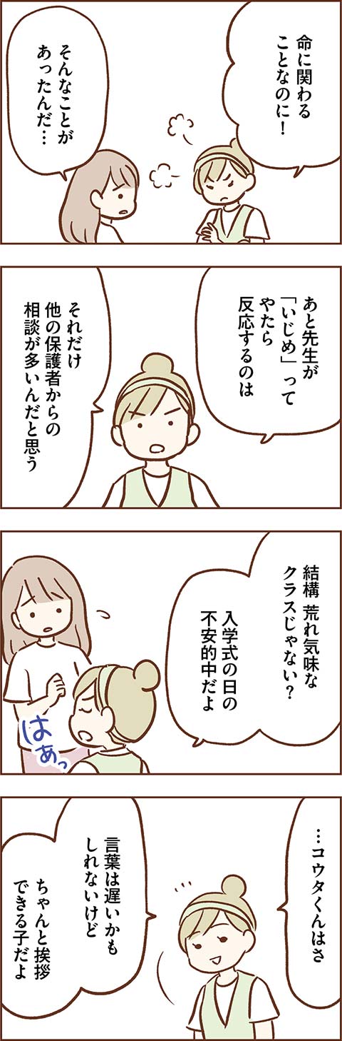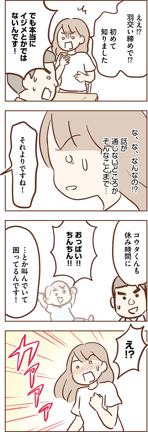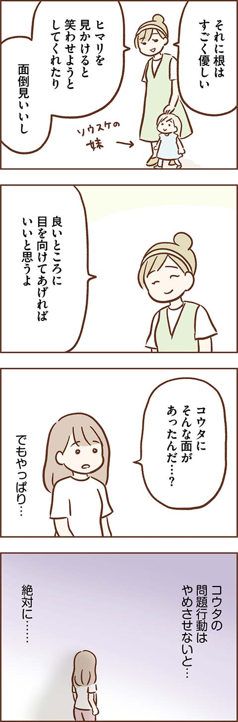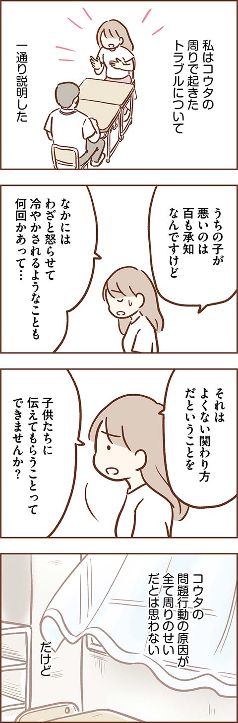 コウタの問題行動を少しでも減らせれば……と先生に相談したものの、かみ合わない会話にモヤモヤがつのってしまったカンナ。このままコウタとお友達とのトラブルは続いていってしまうのでしょうか。カンナの心配は尽きません。