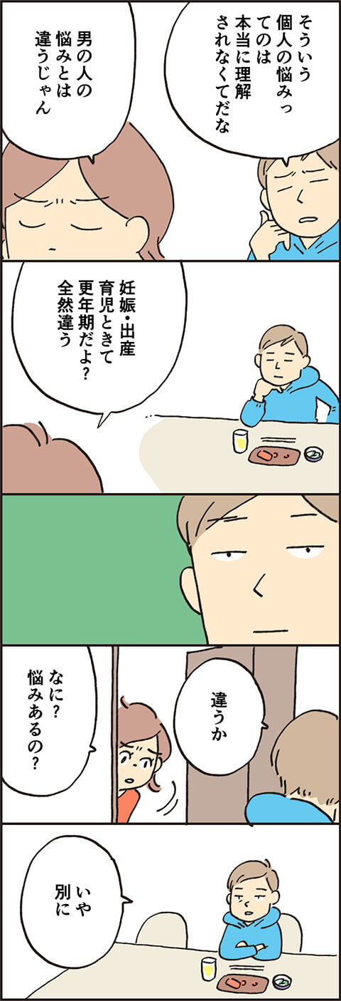 更年期の辛さを理解されず、心ない言葉に傷つく圭子。そんな圭子のかたわらで、夫も理解されづらい悩みを抱えている模様。心の状態は似ているのに、すれ違ってしまう夫婦の今後も気になります。